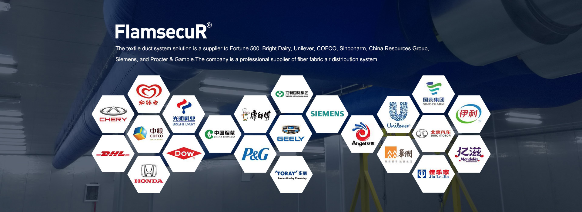 Flamsecur is located in Changshu High-tech Development Zone. It is a company integrating the research and development, design, manufacture and installation of fiber fabric duct systems. The registered capital of the enterprise is 10 million yuan. Since its establishment in 2009, the company has made continuous breakthroughs in development and technological innovation to meet customer needs with customized services. The company's products have passed the certification of the National Fire Safety Construction Material Quality Supervision and Inspection Center, the national textile material environmental protection certification, and the Shanghai Academy of Building Products product performance certification, and etc.